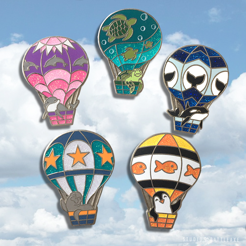 My initial designs featured the animals as the balloon itself, with pennant banners and the basket providing the pops of color. Upon review, the client requested more color be used. I redesigned the pins to have the animals in the basket with the focus being on the colorful designs on the balloons. Adding glitter to the enamel was an inexpensive way to create a higher perceived value for the consumer.