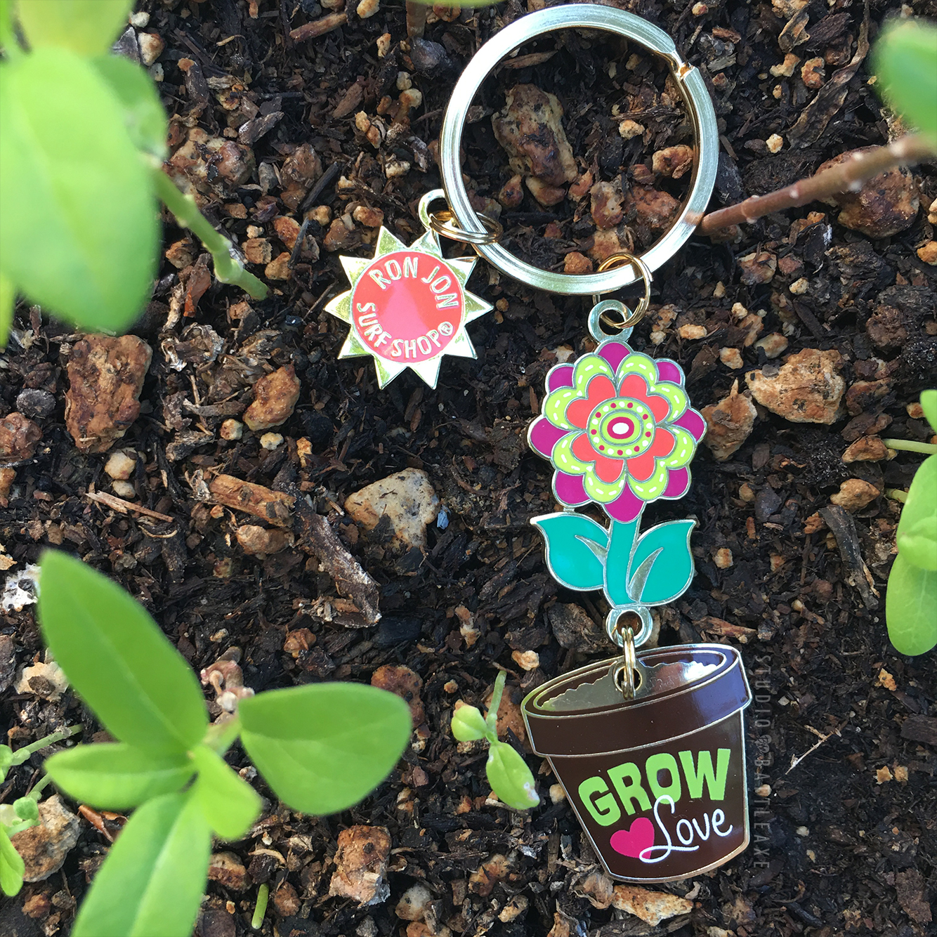 - “Grow Love” is a playful design with with three dangling pieces. Instead of the standard Ron Jon name tag, I chose a basic sun shape to make it look like sun was shining down on the plant.