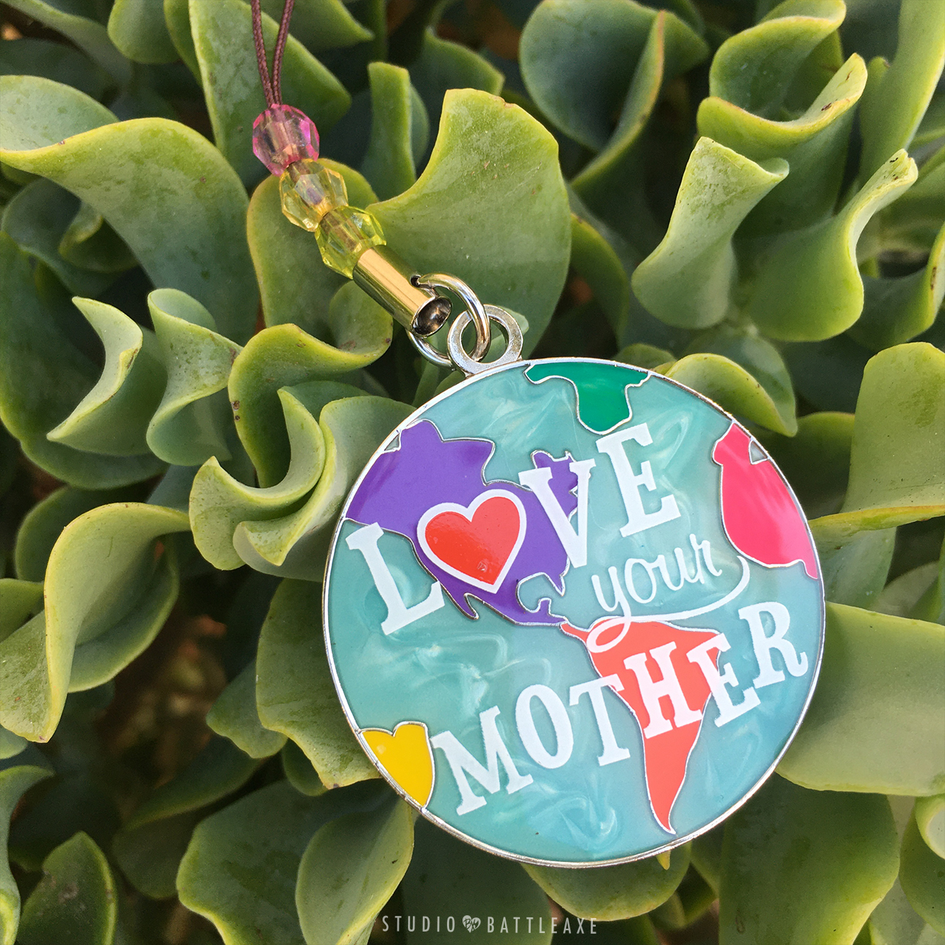 - “Love Your Mother” uses the light blue swirls in the pearl enamel to give the water areas movement. Instead of the standard metal attachments, we used a brown cord and beads to give it a more handmade and earthy feel.